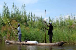Bostwana. Rivière Chobé. Des bateliers locaux (appelés « polers ») se déplacent dans leurs mokoro, ces fameuses barques traditionnelles creusées dans le bois et manœuvrées à l’aide d’une longue perche.