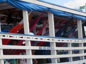 Pour aller d’une ville à l’autre, les Brésiliens prennent des bateaux à trois ponts, ouverts sur l’extérieur et sans cabine. Chacun accroche son hamac où il peut et essaie de tuer le temps dans une promiscuité colorée et animée.