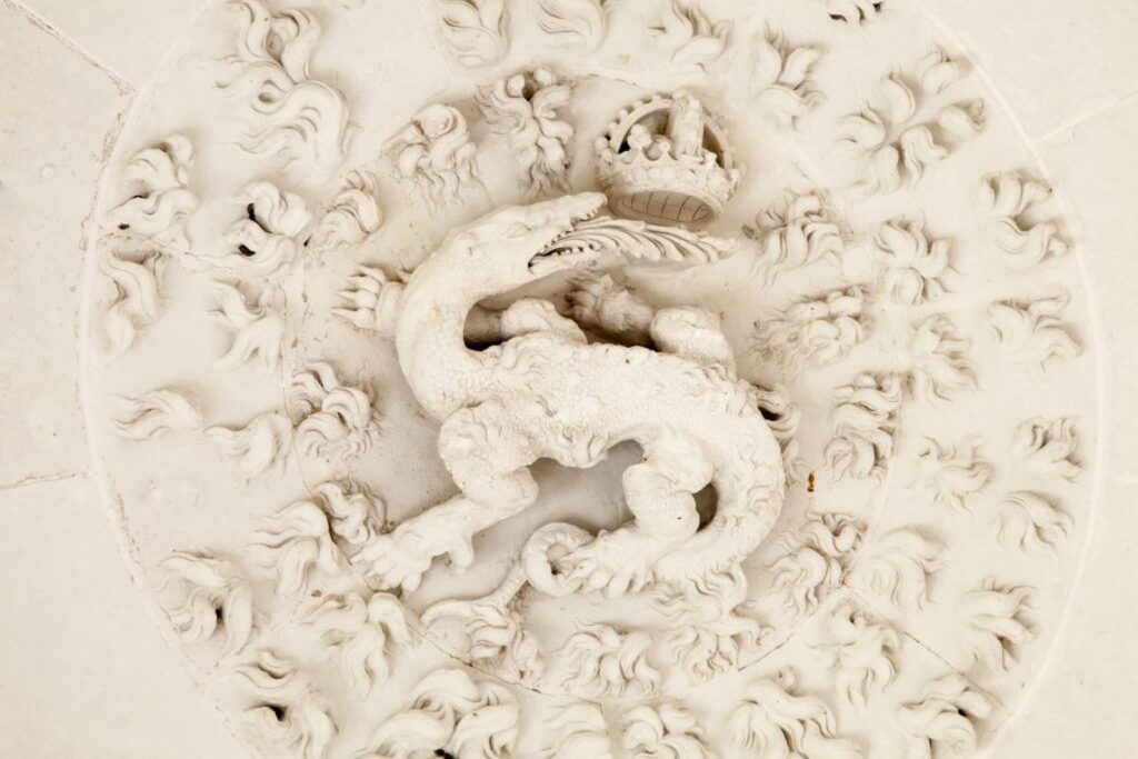 Le roi est très chrétien, il a une fonction temporelle et une fonction sacrée. Arrivé au deuxième étage, dans la salle en croix, nous voyons une alternance de F et de salamandres : certaines avalent le feu et d’autres crachent de l’eau. À Chambord, la salamandre figure plus de 300 fois sur les plafonds et les murs. Avec la devise du roi : « Nutrisco et extinguo », « je nourris (le bon feu), j’éteins (le mauvais) ».