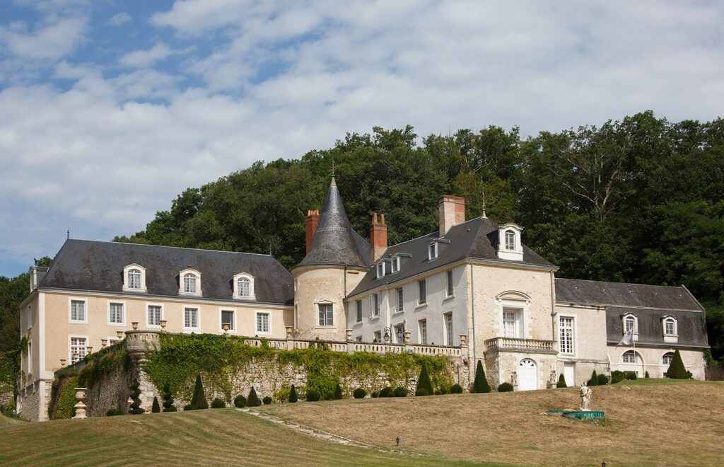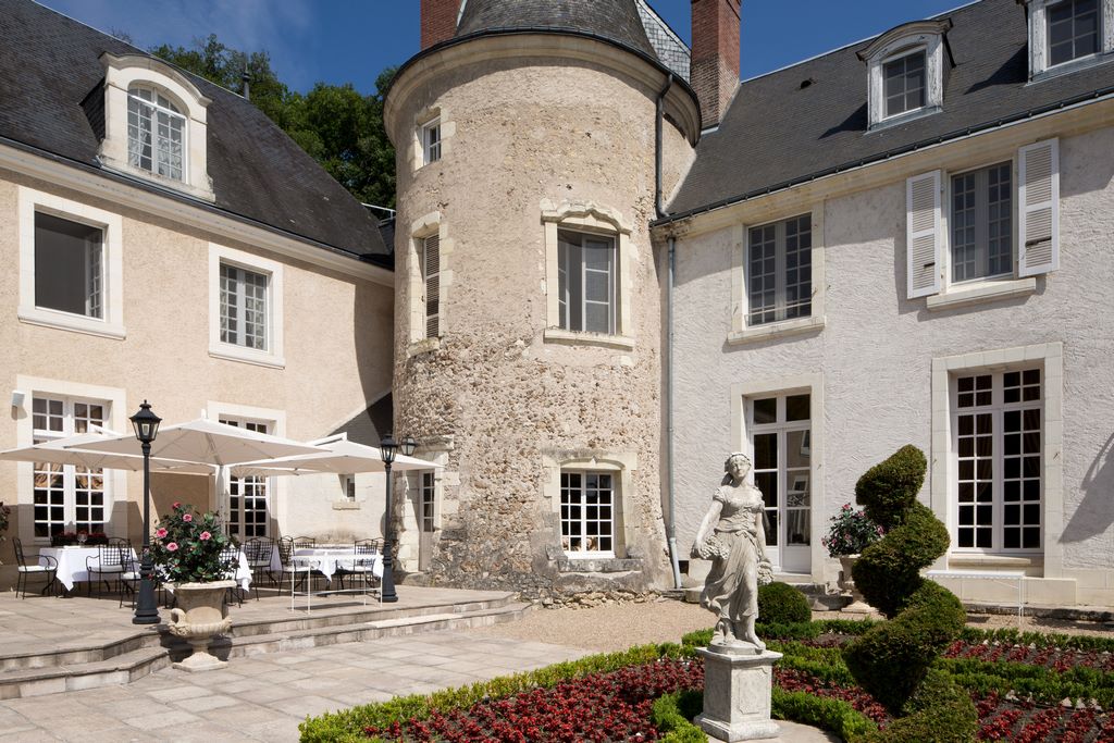 L’arrivée se fait depuis le parc, une transition douce entre l’agitation du dehors et le temps suspendu du séjour. Le bâtiment, typique des demeures seigneuriales de Touraine, ressemble dans ses volumes à un manoir Renaissance : corps de logis en pierre claire, toitures pentues, nombreuses ouvertures sur le parc, terrasses et grandes salles à manger.