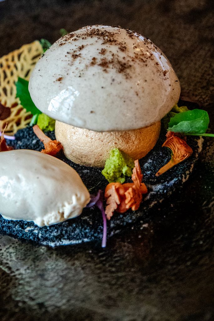 Nous avons choisi le menu nature en 4 temps avec des plats qui fleurent bon la campagne environnante. Nous débutons par une balade en forêt avec une bavaroise champignons, terreau au charbon, velours de shiitake et sorbet champignons. Suivi d’un œuf parfait, jaune d’œuf confit, râpé de truffes d’automne.