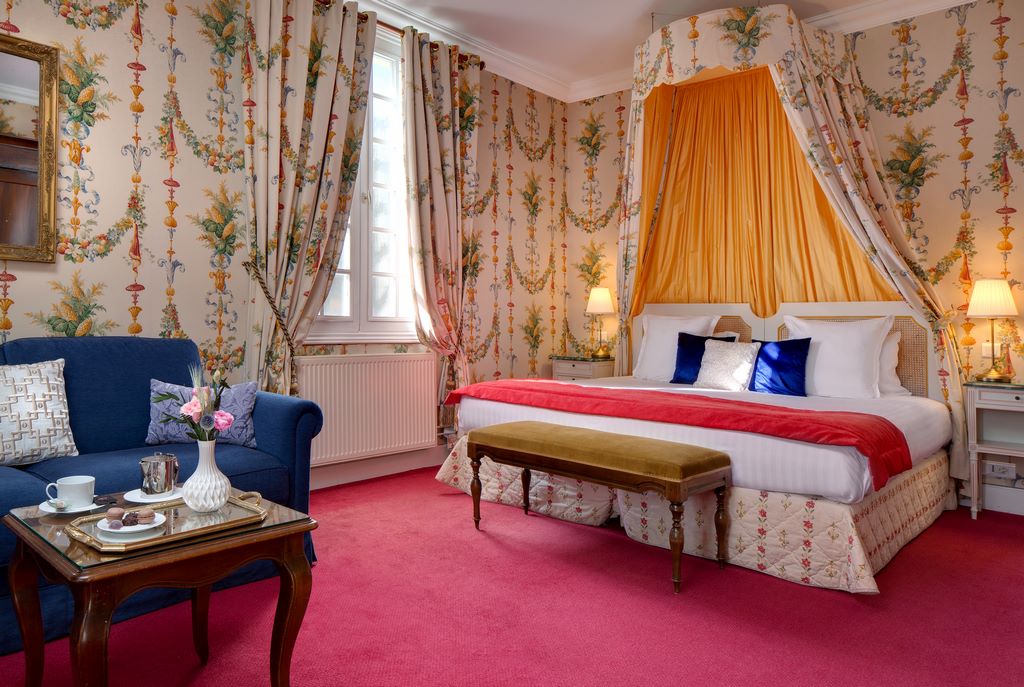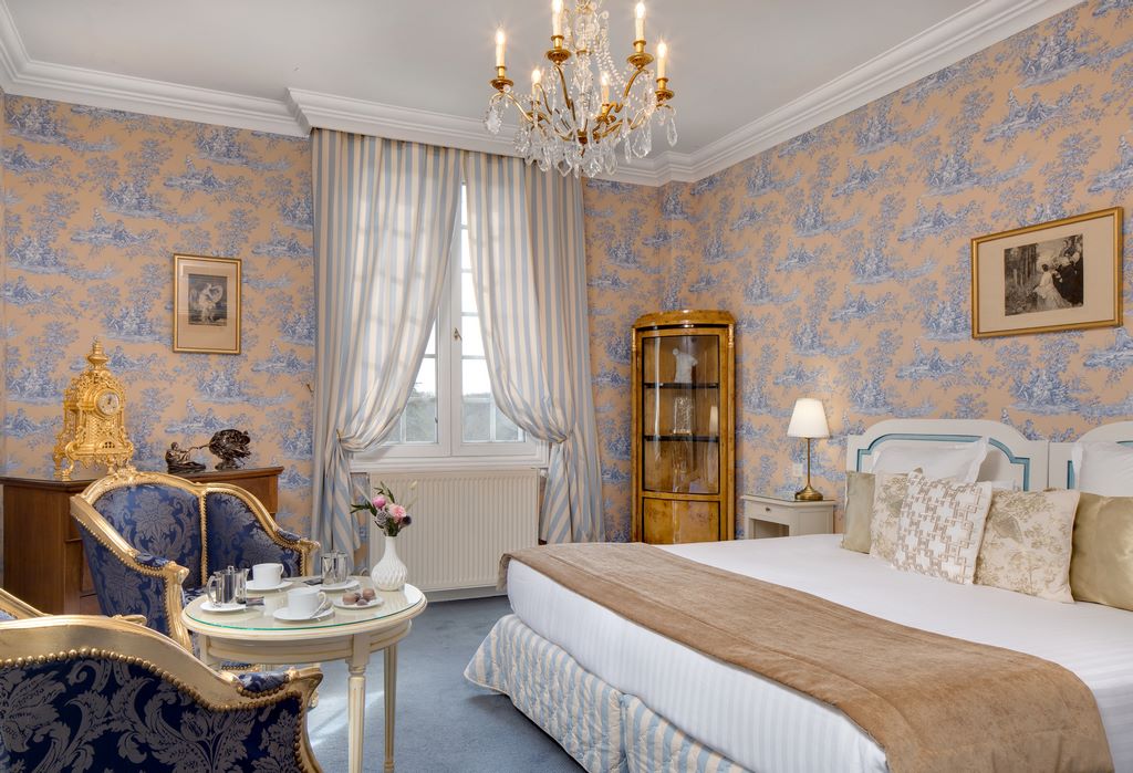 • chambre tradition de 23m², style Louis XIII ou Louis XVI, vue sur la terrasse ou la cour d’honneur