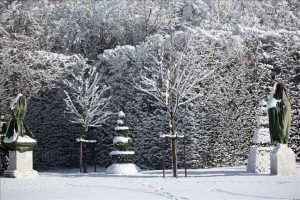 Château de Versailles. Frondaisons enneigées sur lesquelles veillent les statues emmaillotées, telles des gardiennes du temple.