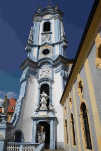 The elegant baroque bell tower of the Dürnstein church is one of the main landmarks of the Wachau region.