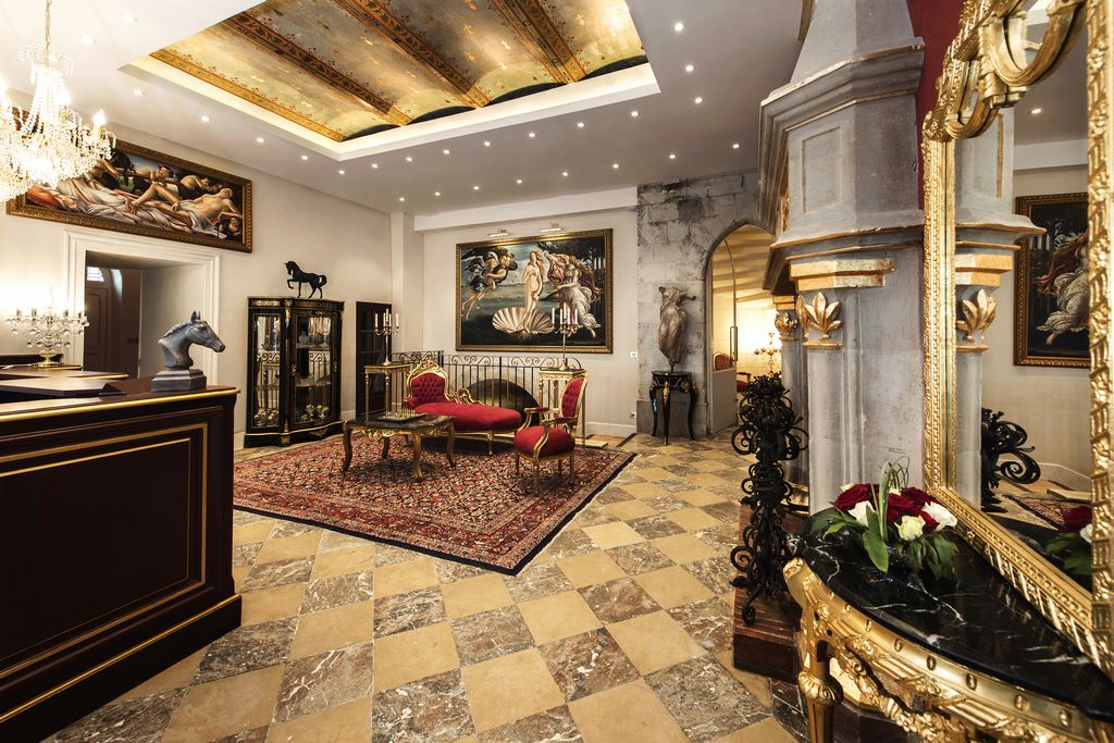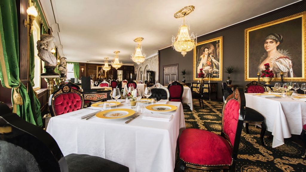 " To restore the house's cachet, we bought 25 Bohemian crystal chandeliers, Boulle furniture and asked copyists in Hamburg to reproduce 12 paintings in the Haut Empire style on the theme of «Return from Egypt».»« say the architects. And to add a touch of history to the establishment, they have hung representations of Bonaparte, Josephine and Murat on the walls.