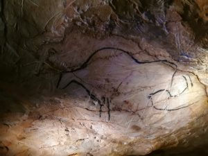 Marseille_Cosquer Méditérranée_Mégacéros traced with charcoal, recognisable by its large dorsal hump. The engraved antlers were added to the animal's head.