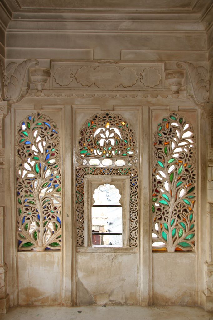 These beautiful homes of wealthy merchants or haveli were so named (haveli comes from hava : air). This is due to the large number of open windows that allow air to circulate during the very hot summers. These windows or jharokhas are veritable lacework of carved stone. They include coloured glass inlays, enamel mosaics and mirrors. These elements are typical of Rajput and Mughal art, often used to create spectacular plays of light inside rooms. They allow light to filter through while protecting the privacy of the ancient sovereigns.