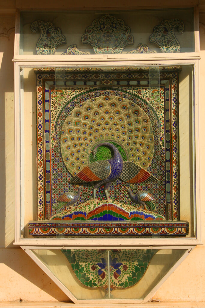 The three peacocks of the Mor Chowk or Peacock Court date from the reign of Maharana Sajjan Singh around 1750 and represent the 3 seasons: summer, winter and monsoon. They are sculpted in high relief with coloured glass mosaics in niches in the courtyard wall. They are made up of 5,000 pieces of coloured glass and glazed tiles. The peacock, India's national bird, has an important symbolic role. According to Hindu mythology, the peacock was created from one of the feathers of the mythical bird Garuda, a majestic bird that carried Lord Vishnu on its back. It is also the vâhana (vehicle) of Krishna.