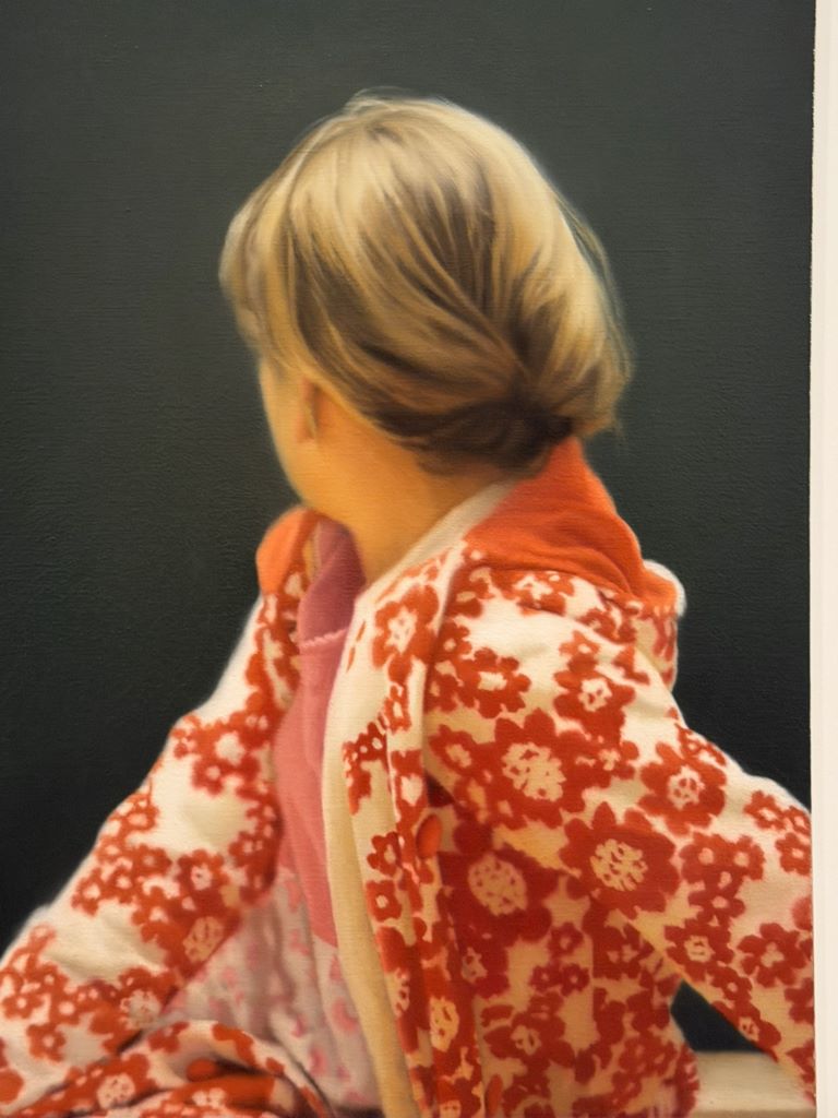 La posture est symbolique : Betty se détourne du spectateur. Elle ne nous regarde pas, et elle tourne aussi le dos à son père (le peintre). Ce geste est souvent interprété comme un refus de l’identification ou une protection de son intimité. On considère généralement que Betty regarde l’une des peintures monochromes grises de son père, situées dans l’arrière-plan sombre. Elle semble ainsi « tourner le dos » à la figuration classique (représentée par son propre portrait réaliste) pour contempler l’abstraction. Le rouge vif et les motifs floraux de sa veste contrastent violemment avec le fond gris/noir austère, créant une tension entre la chaleur de l’enfance et la froideur de l’art conceptuel.