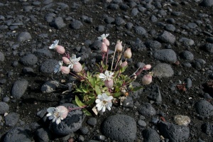 Une touffe de Silène maritime (Silene maritima) illumine un champ de scories et de pierres ponce.