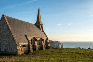 La chapelle Notre-Dame de la Garde surplombe la falaise amont d’Étretat. par Univers Voyage Laissez un commentaire