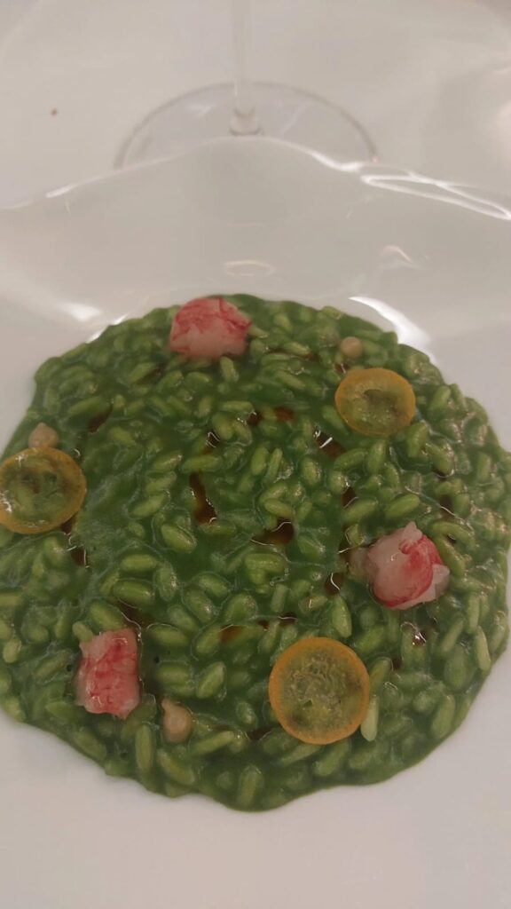La mer s’invite toujours avec subtilité dans une assiette de truite crue et crevette violette, relevée par une eau de tomate Piennolo. Puis, le risotto au persil se pare de crevettes rouges jouant sur un équilibre délicat entre douceur, acidité et intensité marine.