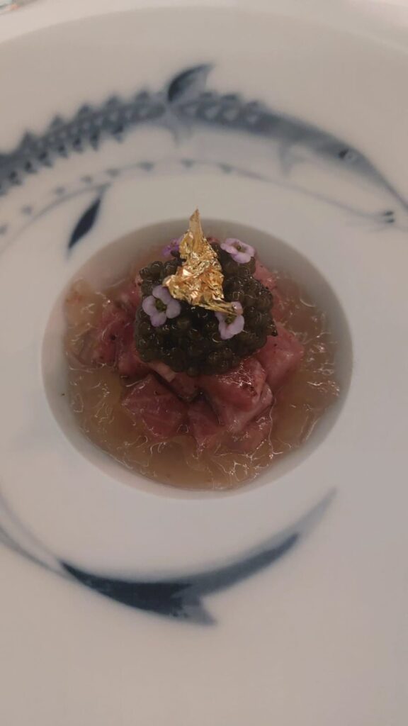 Le voyage débute tout en finesse avec un consommé délicat, prélude à une série d’amuse-bouches : un tartare de Fassona (boeuf piémontais) accompagné d’un cornet à la mortadelle, suivi d’une bouchée iodée de thon et caviar. Vient ensuite le pain maison, pain semi-complet et gressins encore tièdes, sublimé par une huile d’olive vierge extra Laudemio, comme un hommage aux racines italiennes.