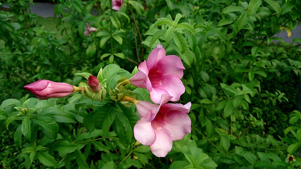 Contrairement à sa cousine jaune (l’Allamanda cathartica), la blanchetii se distingue par ses larges corolles en trompettes d’un violet profond, tirant parfois sur le lie-de-vin. Leur texture, étonnamment douce au toucher, évoque le velours. À La Réunion, on l’appelle affectueusement la « Trompette violette », un nom qui chante autant que sa couleur éclate contre le bleu du ciel.