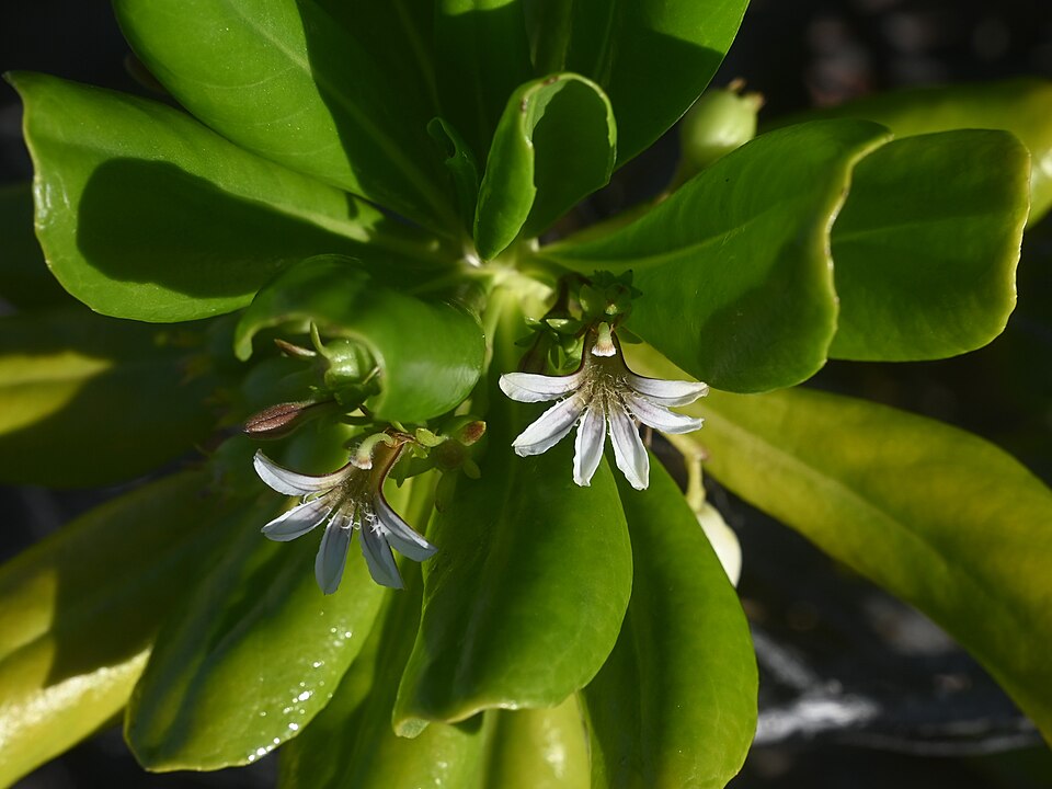 Mais ce qui frappe l’observateur attentif, c’est sa floraison singulière. Les fleurs du Scaevola semblent avoir été coupées net à la moitié, déployant leurs pétales blancs en éventail vers le bas.