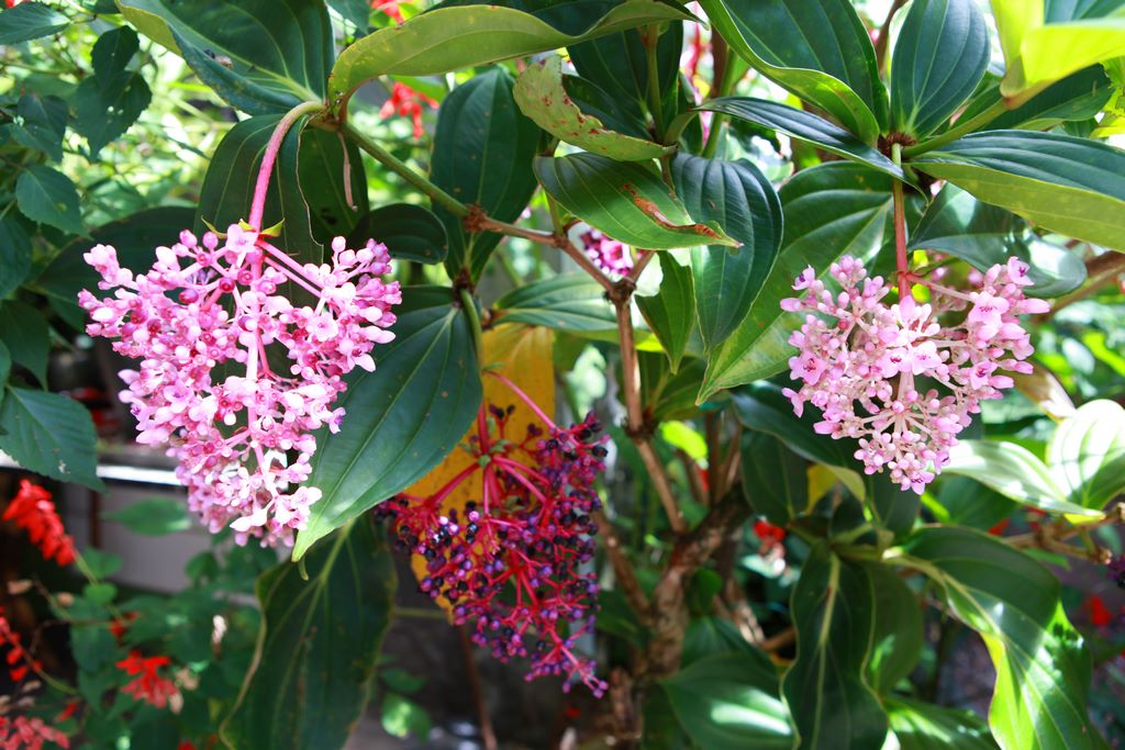 Dans la pénombre rafraîchissante d’un jardin créole, à l’abri d’une varangue ou sous la canopée protectrice des grands arbres, Medinilla speciosa laisse pendre ses grappes roses comme des bijoux végétaux. Originaire d’Asie du Sud-Est, cette plante épiphyte (qui peut pousser sur d’autres végétaux sans les parasiter) a trouvé à La Réunion un écrin d’humidité et de lumière tamisée à sa mesure.