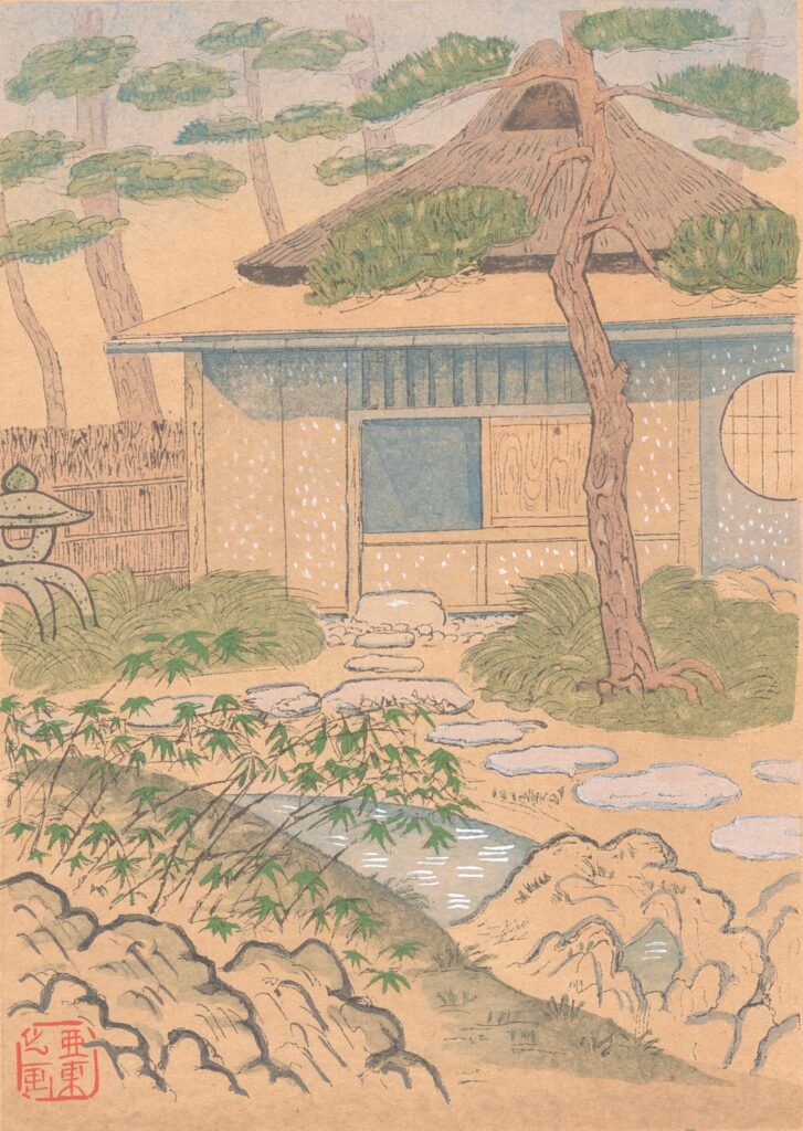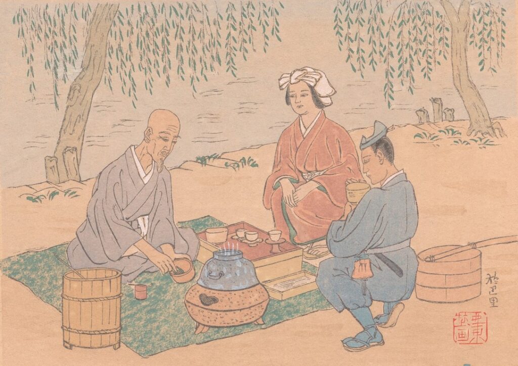 Le thé fut introduit de Chine au Japon au XIe siècle mais l’engouement pour ce breuvage débuta sérieusement au XIIe siècle avec le moine Eisai qui avait étudié les courants les plus récents du bouddhisme, en particulier le zen, et rapporté des graines de théier de l’Empire du Milieu. Cet art de consommer le thé s’est d’abord développé dans les monastères et est inspiré du rituel des moines zen de boire les uns après les autres le thé dans un bol, devant la statue de Bodhi Dharma. Avant de se répandre dans la noblesse qui fréquentait ces lieux, puis dans la caste des samouraïs qui n’avaient pas accès aux autres prérogatives de l’aristocratie. Mais leurs libations (chakai) étaient exubérantes, loin de la cérémonie et du rituel tel qu’il a été institué au XVe siècle par le maître Murata Shukō en réaction à ces banquets licencieux. Ce maître pose les bases d’une Voie du thé plus sobre et dépouillée, le Wabi-Cha, et édicte les quatre valeurs qui doivent permettre la conscience de l’instant et la transformation de soi : l’harmonie, le respect, la pureté du corps et de l’esprit, la tranquillité.