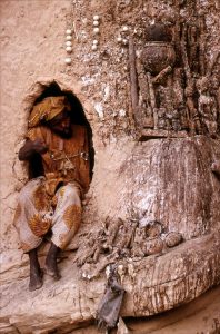 Mali. Pays Dogon. Falaise de Bandiagara. Pays DOGON : Sacrifice de sang de volailles aux statuettes fétiches tutélaires et aux dieux AMMA, BINU et LEBE par un frère chasseurs de l’ancien village Tellem de Koundou Ando. © F Guenet.