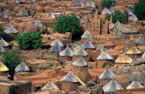 Mali. Une mosquée a été bâtie au milieu des greniers des maisons traditionnelles dogon dans la plaine de Songo, à l’ouest du plateau situé au-dessus de la falaise de Bandiagara. © F Guenet.
