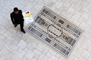 Marrakech. Villa Makassar. Patio intérieur du riad et sa fontaine au centre d’un tapis de mosaïques de l’école autrichienne de Vienne.