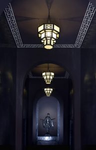 Marrakech. Villa Makassar. La porte sur rue, sculptée dans le cèdre et l’acajou, ouvre sur un long couloir de mystérieuse pénombre au bout duquel veille une statue de bronze.