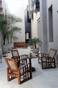 Marrakech. Villa Makassar. Une allée Art Déco ceint le palais et conduit à la piscine située à l’extérieur.
