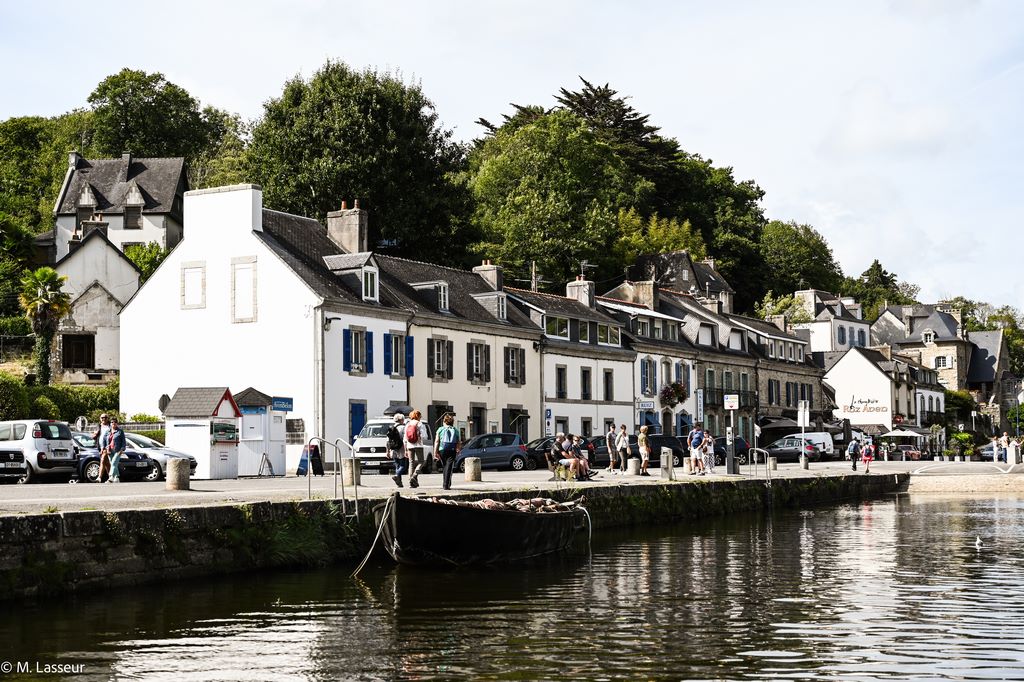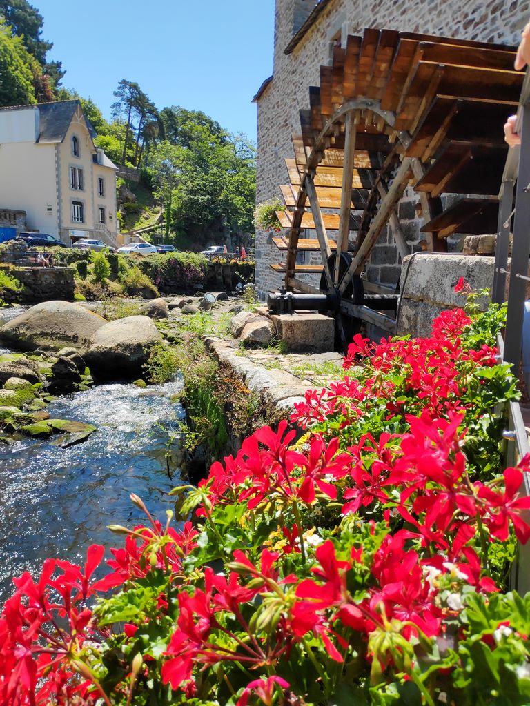 L’Aven court entre les blocs de granit comme une soie verte qui s’effiloche, bruissante, s’arrêtant parfois là où le ciel se reflète tout entier. On peut rêver et imaginer des lavandières, agenouillées, battant leur linge, au milieu de la nature. Ou entendre le bruit des sabots sur les pavés, les cris des enfants qui jouent et les aboiements d’un chien. Dans les ruelles, on croisait autrefois des paysans portant leur fourrage et parfois un artiste égaré qui cherchait le bon angle pour sa toile. Les maisons s’étagent, serrées les unes contre les autres, avec leurs volets bleus, leurs balcons en bois qui ploient sous les géraniums.
