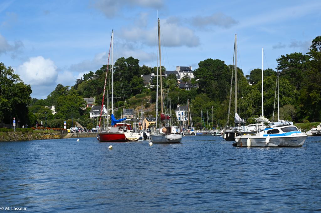Je franchis le vieux pont ; dans une prairie quelques vaches immobiles semblent ruminer l’éternité. La rivière s’alanguit, prend des airs de mer douce, bordé de coques peintes qui reposent dans la lumière, amarres gémissant comme des cordes de violoncelle. L’eau n’est plus la ressource attendue des moulins : elle respire et reflète le ciel d’un gris tendre, traversé d’éclats d’ardoise et de blancheur. Le chemin s’ouvre et le port surgit comme une confidence.