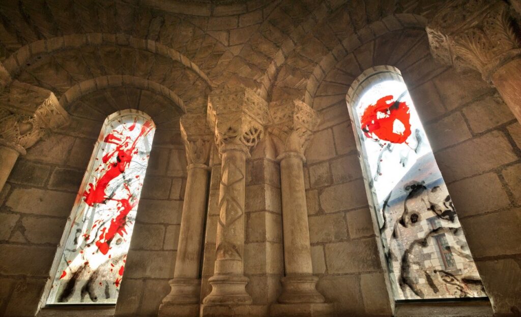 Très sobres, créés à l’encre de Chine, les vitraux sont constitués de taches rouges, noires ou grises. Ils ont été inaugurés en juillet 2010.
