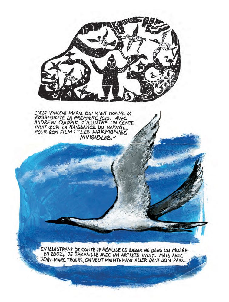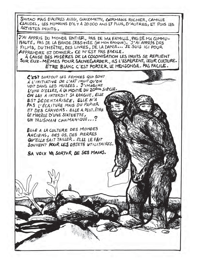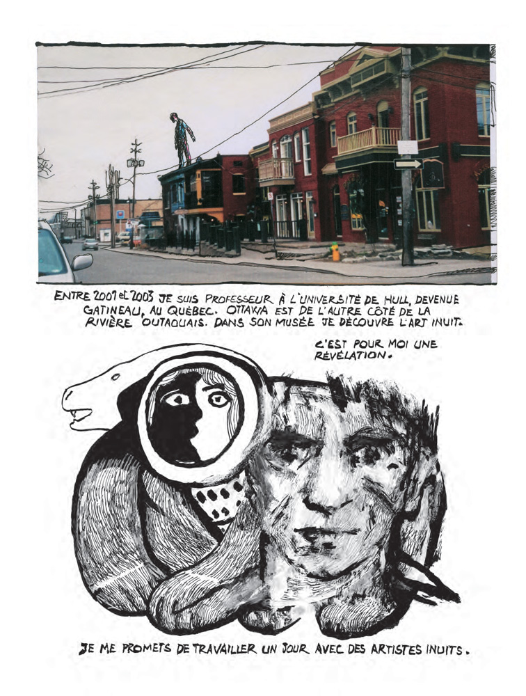 Les Inuits que j’ai rencontrés dans le Nord du Nunavut m’ont beaucoup touché. J’y suis allé avec ma compagne Isabelle Duthoit, qui est musicienne, et avec Edmond Baudoin (1). Nous souhaitions les interroger sur leur rapport à l’art et sur leur vision de l’avenir, en particulier face aux menaces qui pèsent sur leurs traditions dans un contexte de bouleversements rapides : sédentarisation, accords avec les compagnies minières, forages, changements climatiques,etc. Car les modes de vie se sont radicalement transformés au cours du siècle passé.