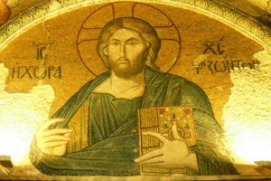 Le Christ Pantocrator est représenté tenant les saintes Ecritures dans la main. Autour de son visage, il est écrit « Jésus-Christ et le lieu de la vie. »