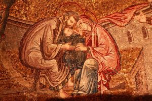 Chora. À l’ouest de la voûte d’une des parties du narthex intérieur, on trouve une mosaïque représentant l’adoration de Marie. Son père, Joachim, et sa mère, Anne, adorent leur fille Marie qu’ils tiennent entre leurs bras.